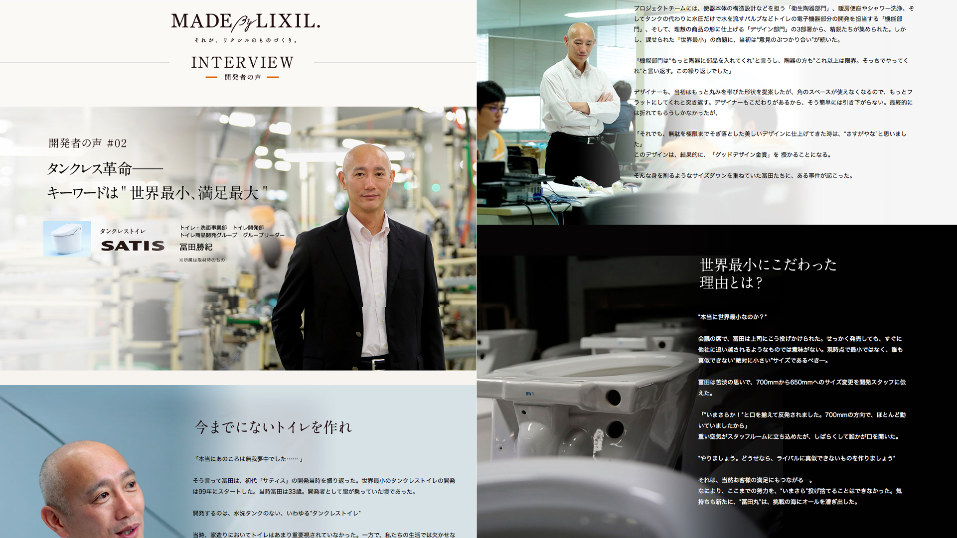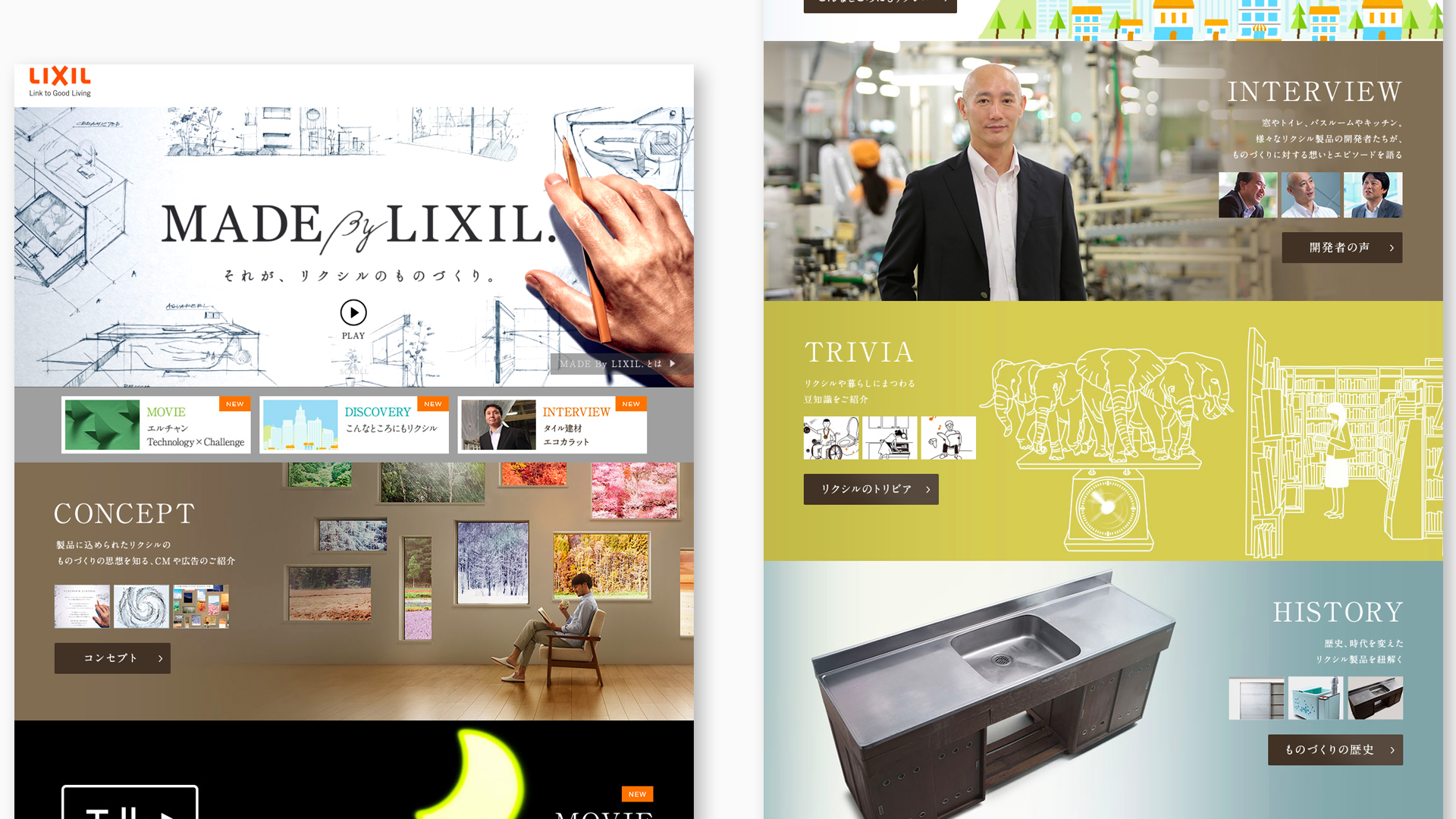 MADE By LIXIL. 住まいと暮らしの総合住生活企業LIXILのスペシャルサイト「MADE By LIXIL.」の企画・クリエイティブディレクションを担当。リクシルのものづくりに取り組む姿勢を、開発担当者にインタビューして記事化したコンテンツや、リクシル商品や技術を使ったアートやドラマ仕立てのムービーコンテンツなどを企画・制作。 Client 株式会社 LIXIL Role Creative Direction +Planning +Copywriting Category web movie writing Next Work Works Top Previous Work ウェブサイト インタビュー記事はこちらから チョーメイク術 ※ご視聴にはpassが必要です。 妄想入浴図鑑 ※ご視聴にはpassが必要です。 #かぎあるある ※ご視聴にはpassが必要です。 嫁姑キッチン一本勝負 ※ご視聴にはpassが必要です。