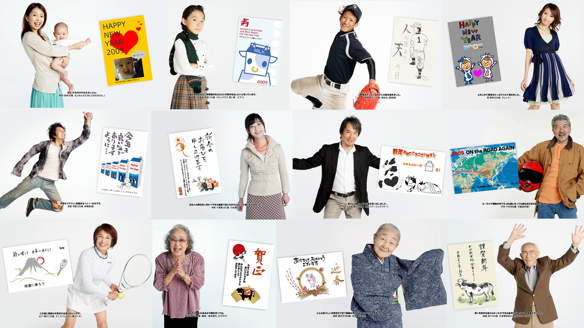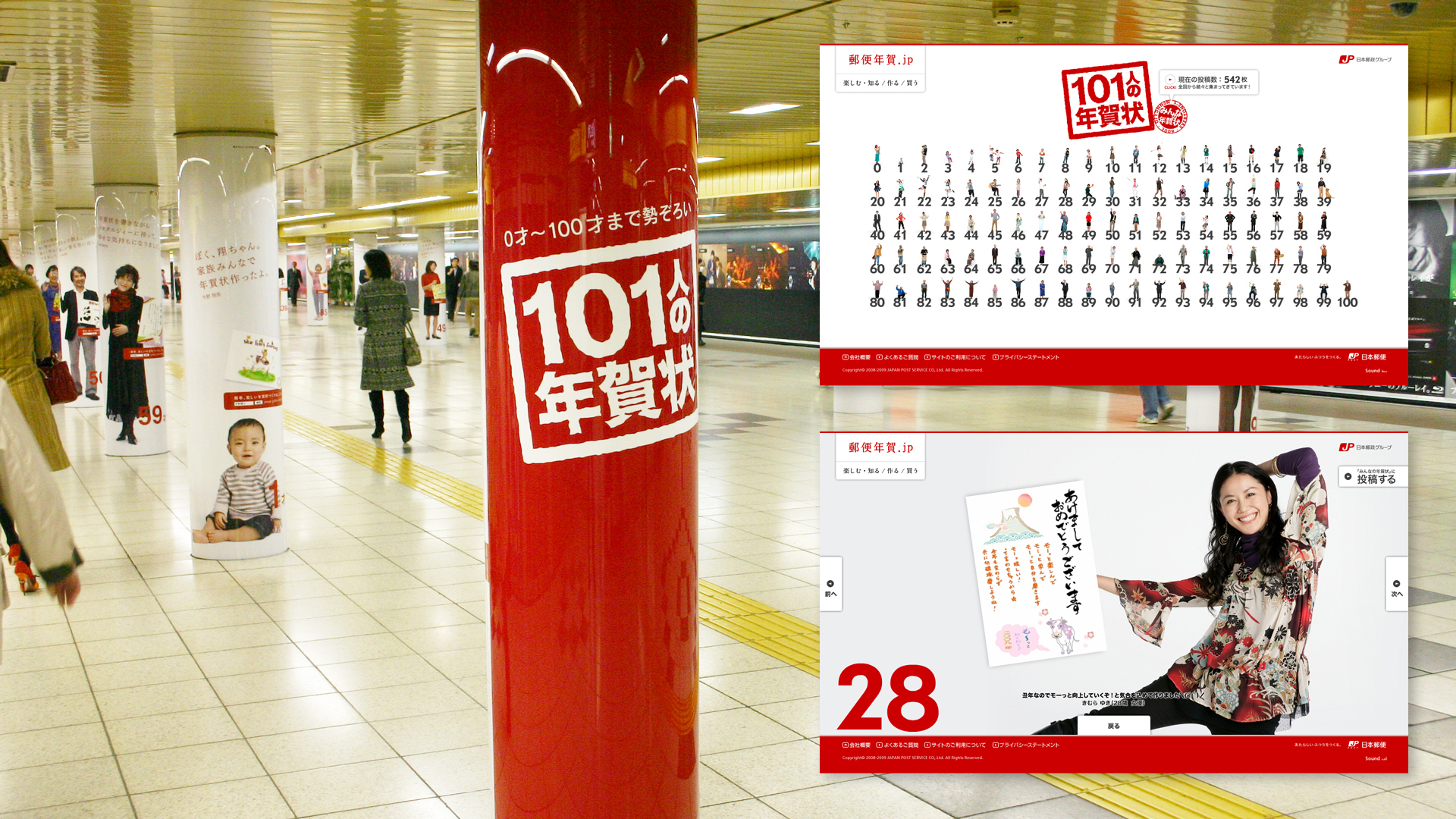 2009年度に公開した「101人の年賀状」は0歳から100歳までの年賀状を公開。写真家ND.CHOW(アンディ・チャオ)氏が101人を撮り下ろした。コンテンツが好評だったため、当初予定してなかった新宿地下鉄通路での柱巻のグラフィック広告として展開。また、年賀状のデザインを簡単につくれるツール「はがきデザインキット」や写真などからはんこがつくれる「手作り風はんこ作成ツール」も公開。その後10年以上にわたり、年賀状を作成するデジタルツールとして多くの方が利用するコンテンツに成長した。(前会社で担当)
