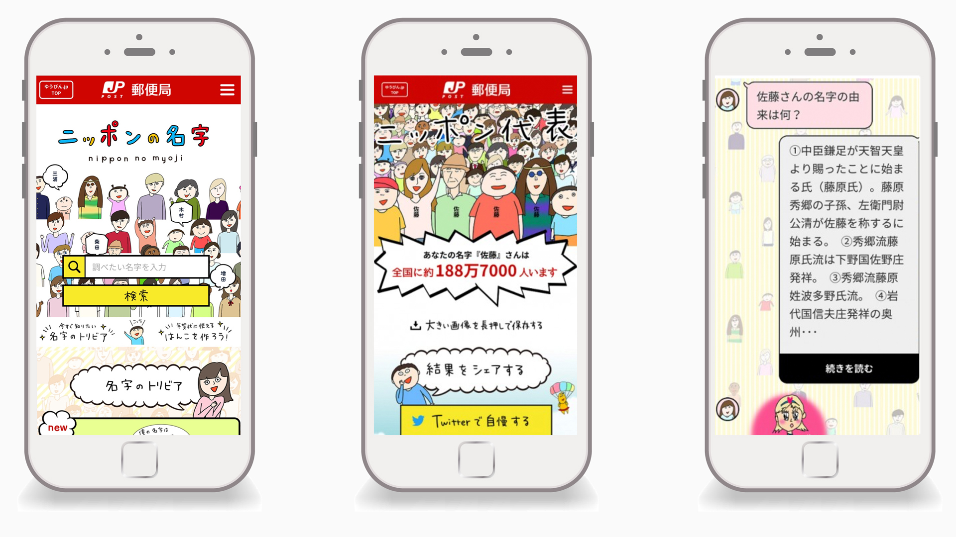 2018.9月に公開した「ニッポンの名字」は自分の名字のランキングや由来などが簡単に調べられるコンテンツ。SNSで話題となり、1700万以上の名字が検索され話題に。