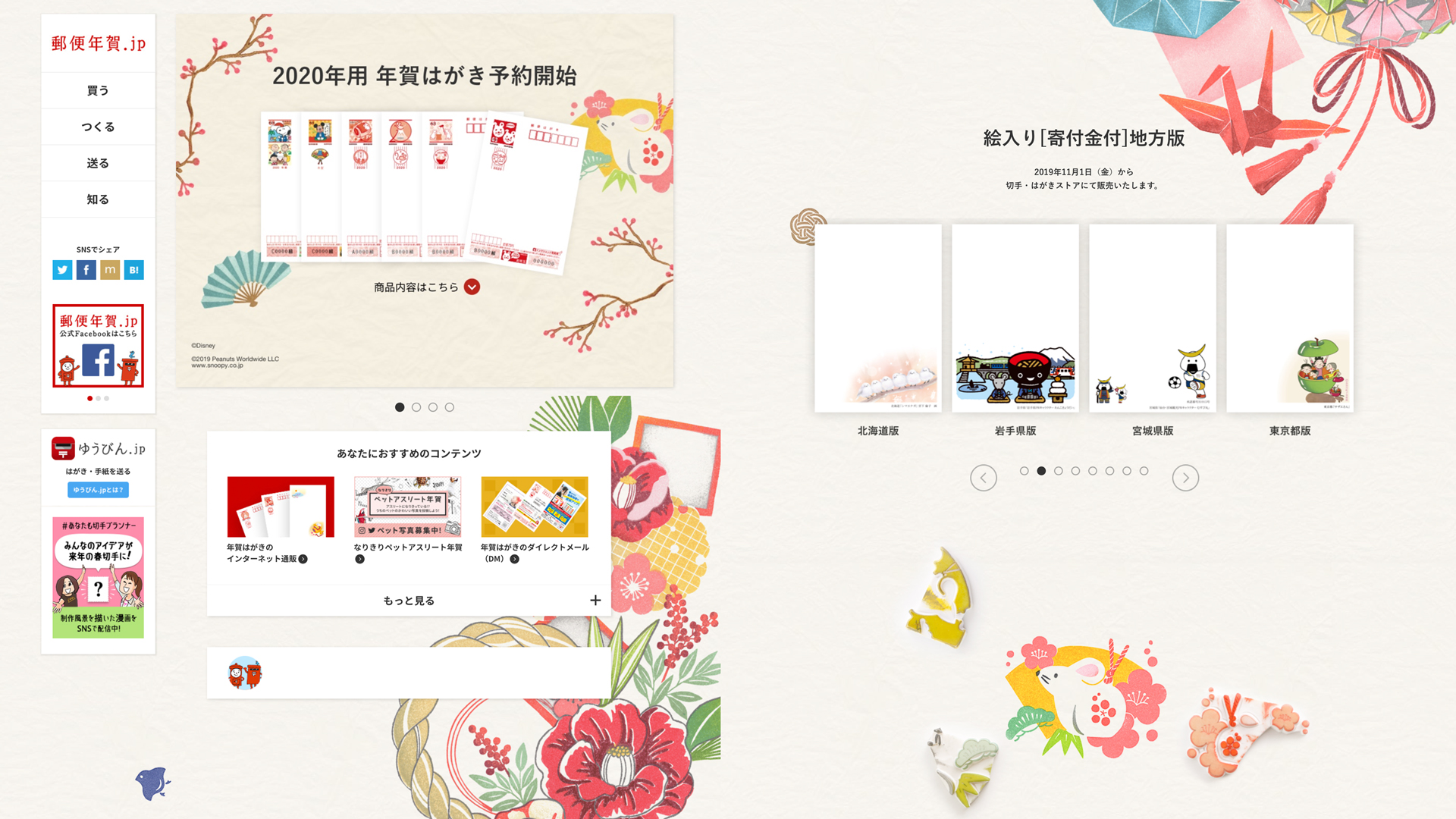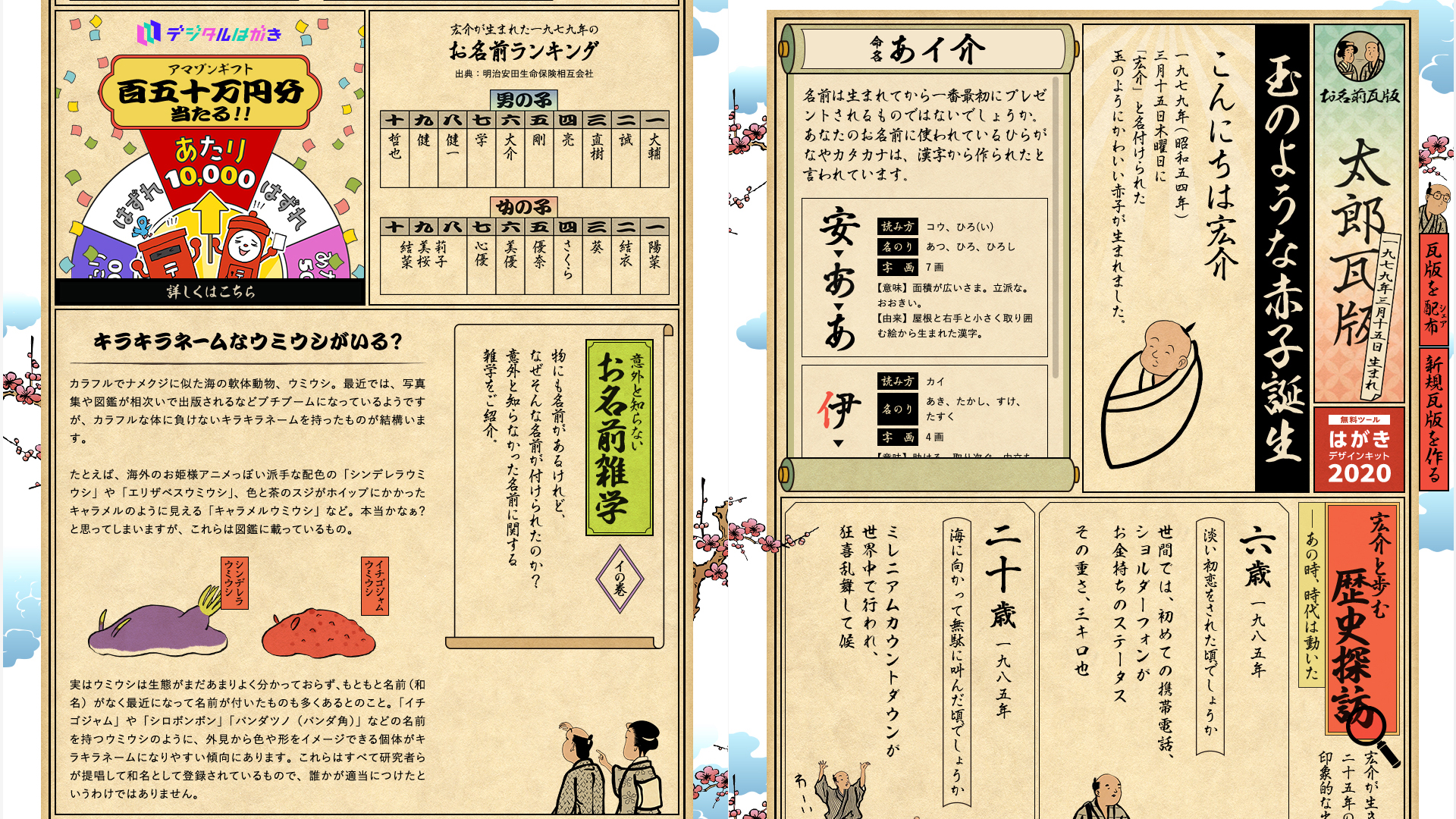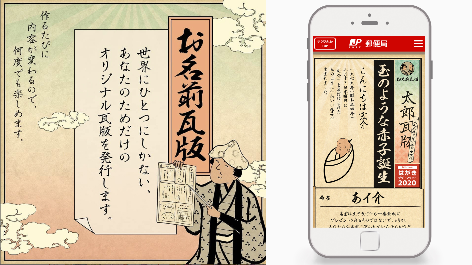 郵便年賀.jp 2020年度 年賀はがきのプロモーションサイト「郵便年賀.jp」2020年度版。消しゴムはんこアーティストの田口奈津子氏とコラボ。前年に好評だった「ニッポンの名字」の第二弾として、自分の名前の瓦版がつくれる「お名前瓦版」などのコンテンツを企画・制作。 Client 日本郵便株式会社 Role Creative Direction +Planning +Copywriting Category web Next Work Works Top Previous Work ティザーサイト お名前瓦版 お名前瓦版 ペットアスリート年賀状 2020年用オリジナル年賀状デザイン