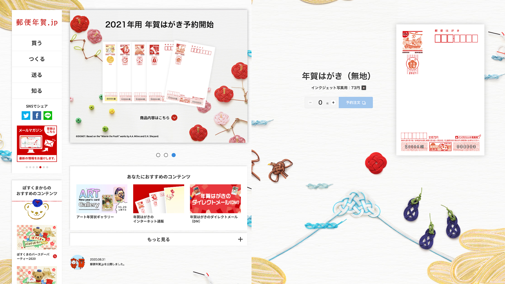 郵便年賀.jp 2021年度 年賀はがきのプロモーションサイト「郵便年賀.jp」2021年度版。水引アーティスト長浦ちえ氏とコラボ。アートな年賀状の投稿コンテンツ「アート年賀状」では、アドビのアプリ「Adobe Photosop Camera」やハンドメイドマーケットプレイス「Creema」 ともコラボ。自分の声や人気声優がおしゃべりする年賀状が作れる「おしゃべり年賀状」など、楽しく年賀状が作れるコンテンツを企画・制作。 Client 日本郵便株式会社 Role Creative Direction +Planning +Copywriting Category web Next Work Works Top Previous Work ティザーサイト アート年賀状ギャラリー おしゃべり年賀状 願望年賀状 2021年用オリジナル年賀状デザイン
